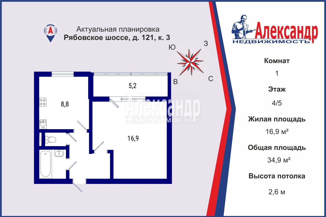 • Жилая площадь 16.90 м2